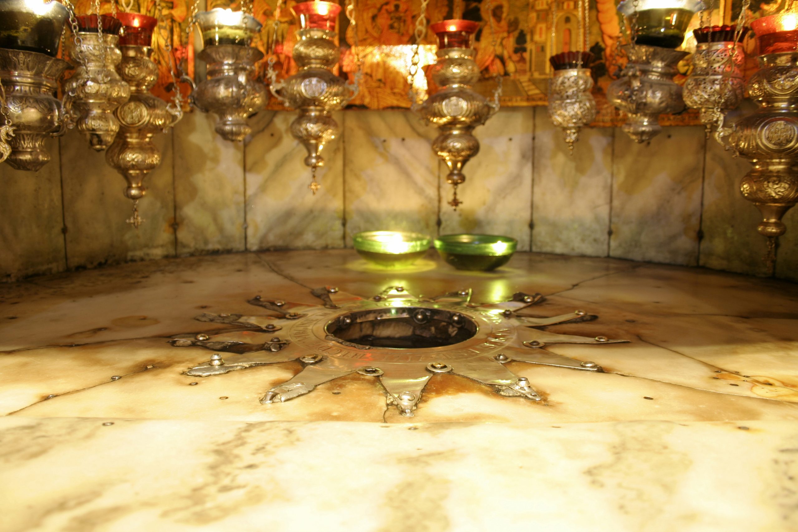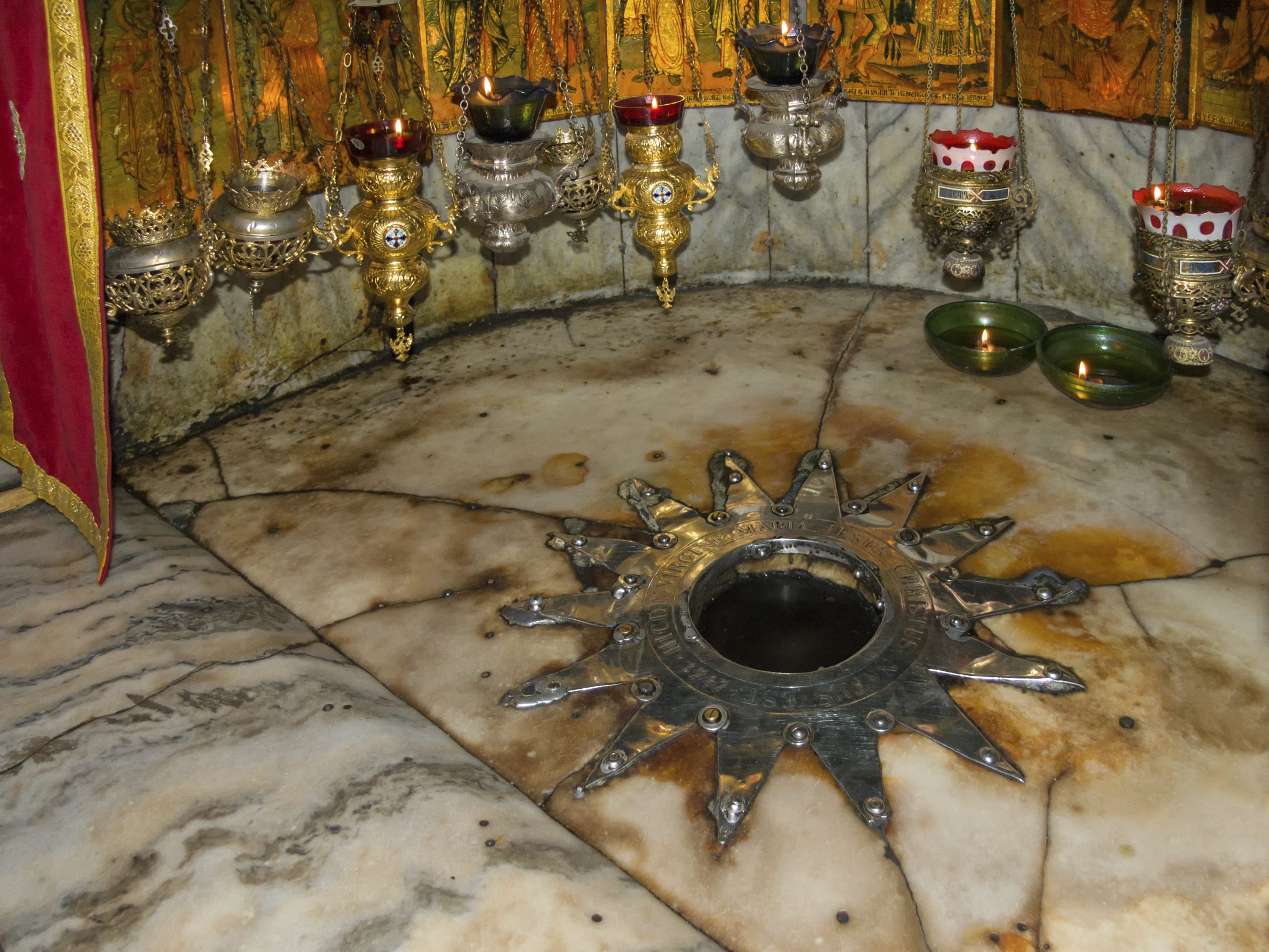 A 14-point silver star marks the spot where Jesus was born (inscription: “Hic de Virgine Maria Jesus Christus natus est”)